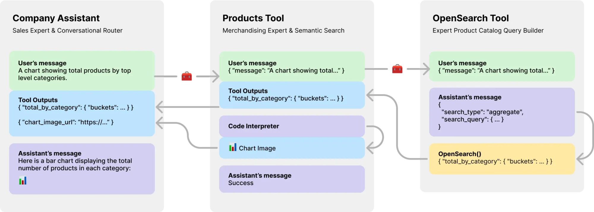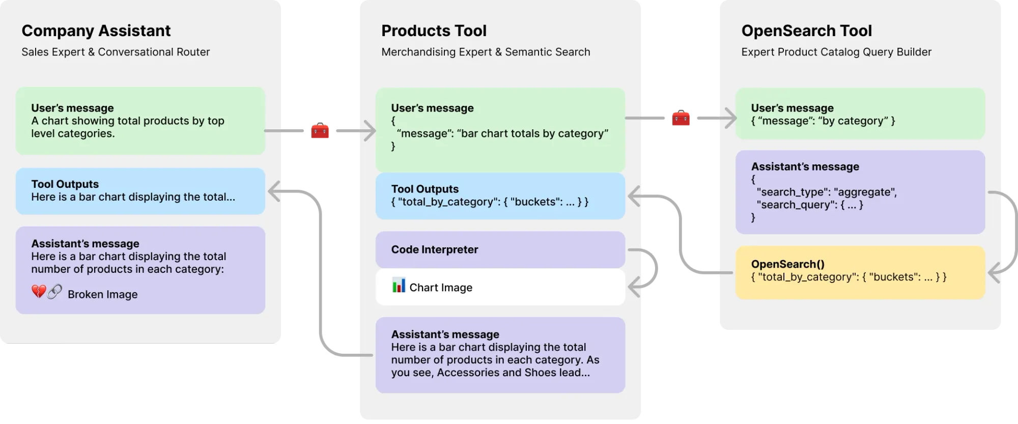 - Assistants-only outputs. The typical mental model for most Multi-Agent Systems (MAS) takes the output of one LLM as the input or results to another. See how the Products Tool got all the great aggregate category information? But the main assistant only knows what it was told. If asked a followup question, it would not have the true data to respond. Worse, it may summarize a summary to the user. Also, that Product Tools output is just wasted tokens.