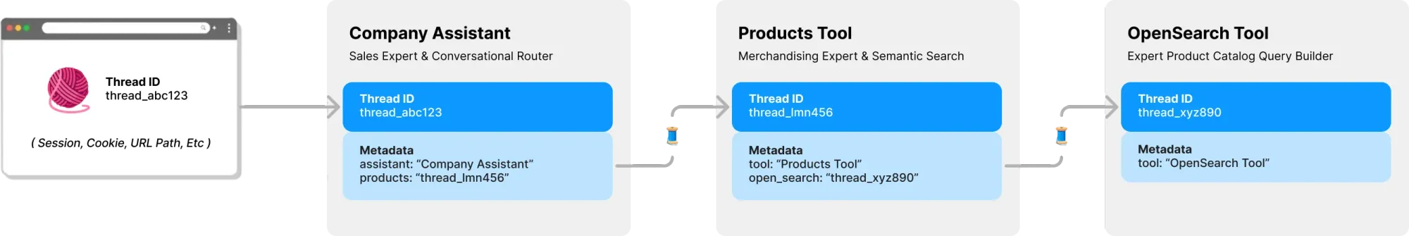 All questions to your experts require a thread ID. For chat applications, the ID would be stored on the client. Such as a URL path parameter. With Expert.js, no other client-side IDs are needed. As each Assistant calls an LLM backed Tool, it will find or create a thread for that tool as needed. Experts.js stores this parent -> child thread relationship for you using OpenAI's thread metadata.