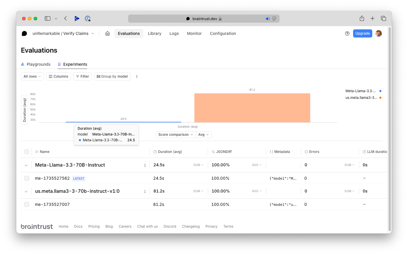So how much faster is SambaNova than other inference platforms? We could time those command but I thought it would be fun to use Braintrust's platform which make it really easy because it can leverage Vercel's support for OpenTelemetry. Braintrust comes with dozen's of evals including JSON output following a schema. Perfect for dealing with some open-source model's lack of support for Structured Outputs.