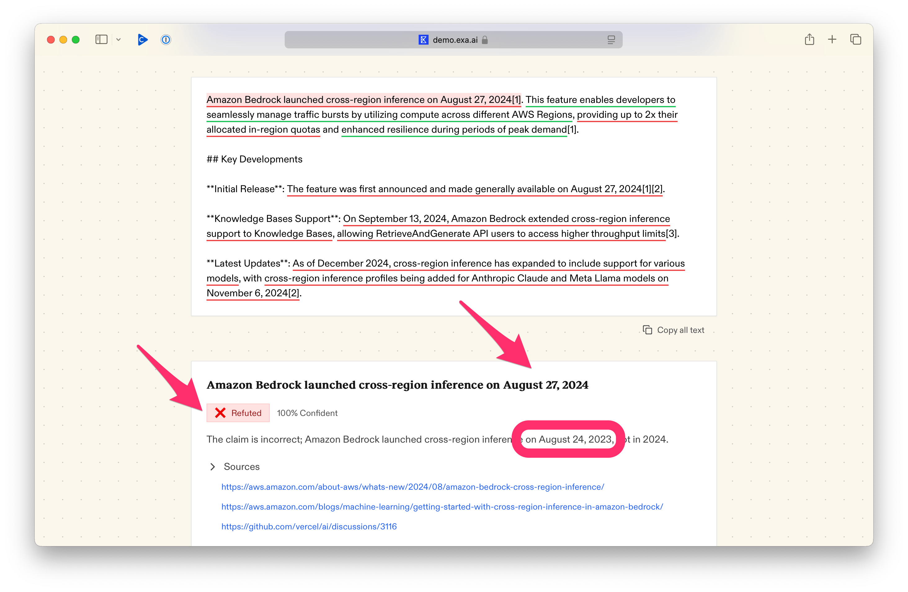 I thought it would be fun to see how Exa's search would validate (or not) a basic Perplexity search. So I asked it, "When did Amazon Bedrock come out with cross-region inference?" and then ran that claim through Exa's tool.