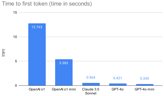 The secret behind o1 and o3's huge gains in the ARC AGI evaluation? It's called "test-time compute" - basically letting the model take its time to "think." While o1 can crank out about 150 Tokens Per Second (TPS), there's a catch: its reasoning abilities come with a longer Time to First Token (TTFT), which means you're waiting longer overall. You can see this trade-off in the graph above (right) from Vellum's comparison of OpenAI o1, GPT-4o, and Claude 3.5 Sonnet. OpenAI's o1 model is approximately 30 times slower than GPT-4o. Similarly, the o1 mini version is around 16 times slower than GPT-4o mini.