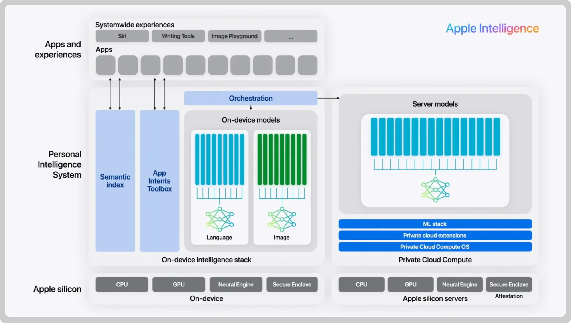 At the heart of this ecosystem is a novel architecture. Apple has developed a new frontier Small Language Model (SLM) shared through a fine-tuned adapter architecture. This enables on-device intelligence to create images and provide system-wide writing tools for highly personalized use cases, such as photo search, smart email notifications, writing tone adjustments, and context-aware actions across devices.