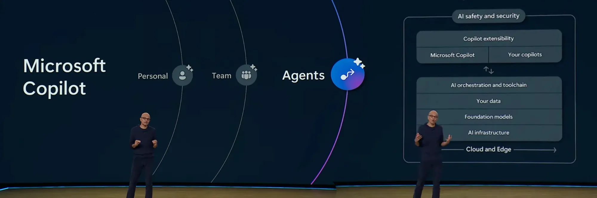 On the Business side, we have Microsoft Copilot Studio, an AI agent builder that can personalize Copilot on your PC or external customers. Copilot Studio provides familiar tools such as instructions, triggers, knowledge, actions, and interactive HTML elements with their Adaptive Cards framework. It’s built for enterprise productivity. Like in a good way. It integrates seamlessly with Microsoft 365 & Teams and connects to data sources like Salesforce or Jira. You can also deploy your Copilots to numerous channels, including Slack. But the biggest news is in their orchestration toolchain, to quote Satya Nadella.